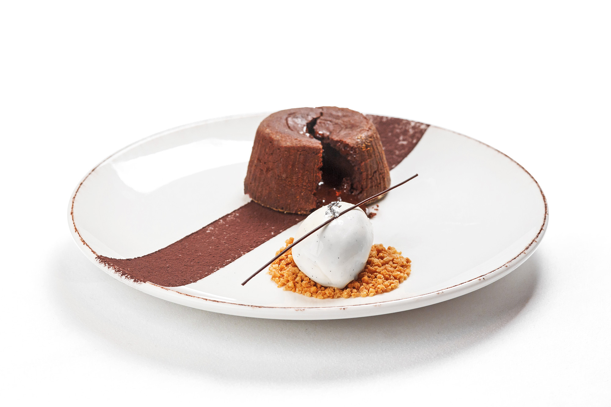 Готовим Фондан: шоколад и сливочное масло растапливаем на водяной бане. Яйцо, желток, сахар взбиваем в пышную массу. В яичную массу добавляем муку, а затем в получившуюся смесь вводим шоколад, разливаем по смазанным маслом и присыпанным мукой формам и замораживаем. Отпекаем при 200 градусах примерно 9 мин.